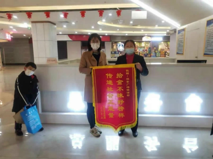2021年1月26日,馬女士將一面寫著“拾金不昧好榜樣,傳遞社會正能量”字樣的錦旗送到了招金廣場,贊揚招金人拾金不昧的精神。原來,前段時間招遠市突降大雪,招金廣場工作人員溫雪蓮在清掃南廣場積雪時,撿到了一部價值近萬元的手機,隨后馬上主動上交給公司。為方便失主聯(lián)系,工作人員一直給手機充電,確保手機通暢,當晚失主便通過手機聯(lián)系到招金廣場,經(jīng)確認后,手機完璧歸趙。