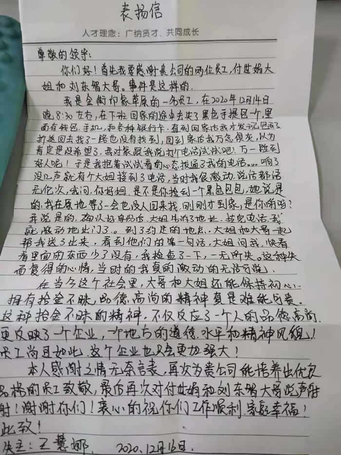 “招金有這樣的員工真是好樣的,真是太感謝你們了!”12月16日上午,拖著疲憊身軀但充滿興奮神情的王女士帶著感謝信來(lái)到山東招金金銀精煉有限公司,向我們道出了一段不為人知的招金好人好事。